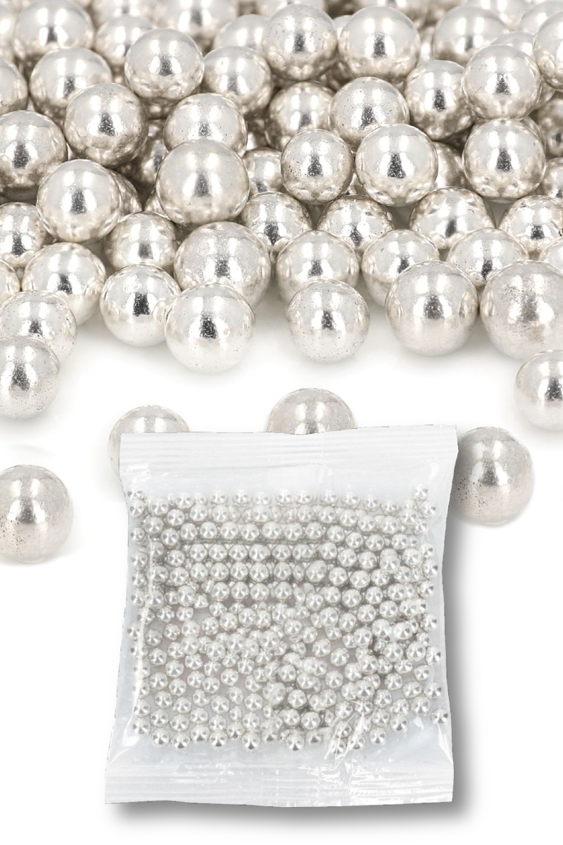 Látványos, fényes felületű, ehető cukorgyöngy ezüst árnyalatban. 10mm